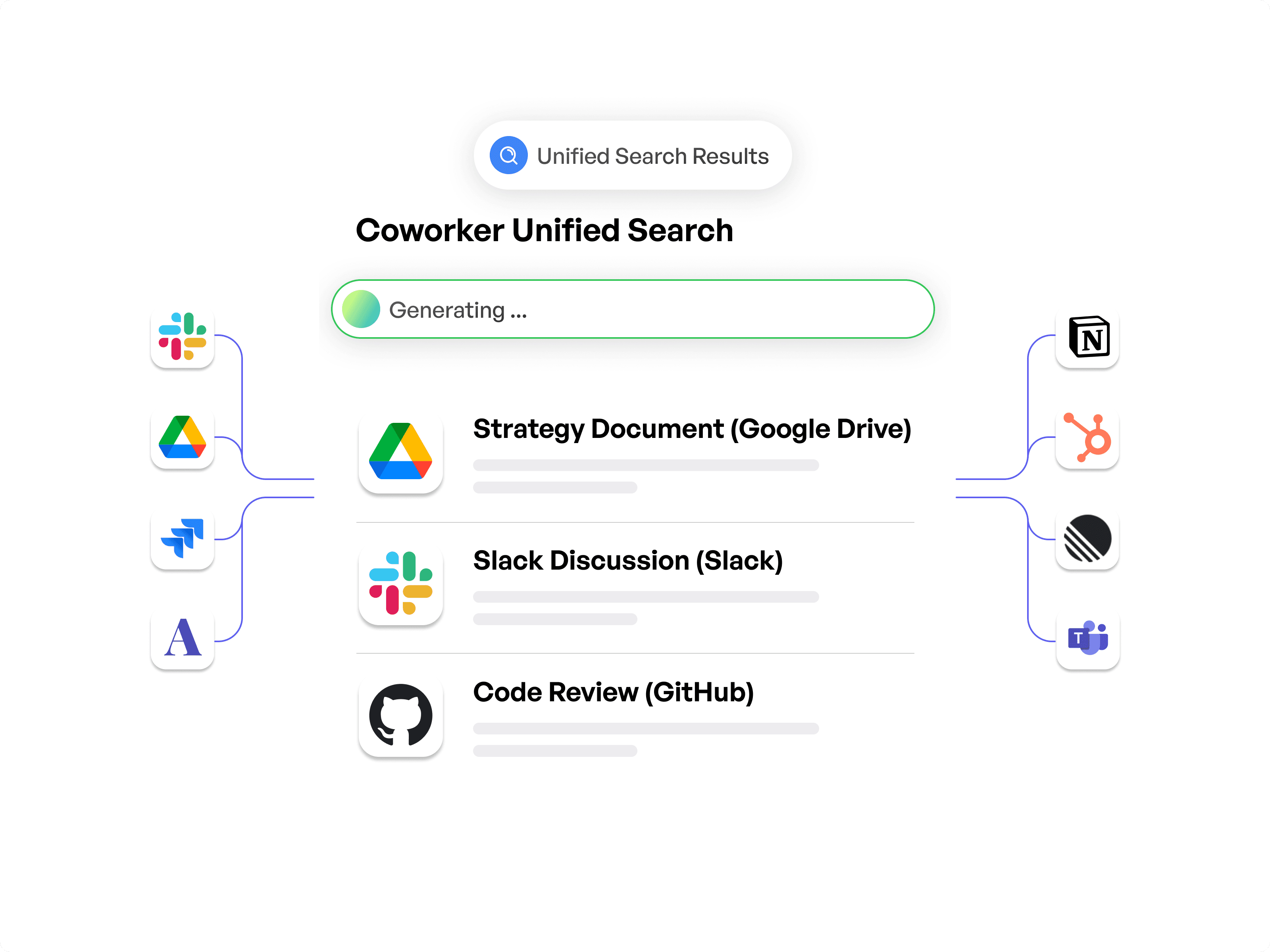 Knowledge spread across platforms creates long lookup times and missed signals. Coworker connects across apps so searches return the most relevant document, discussion excerpt or code review in one result.