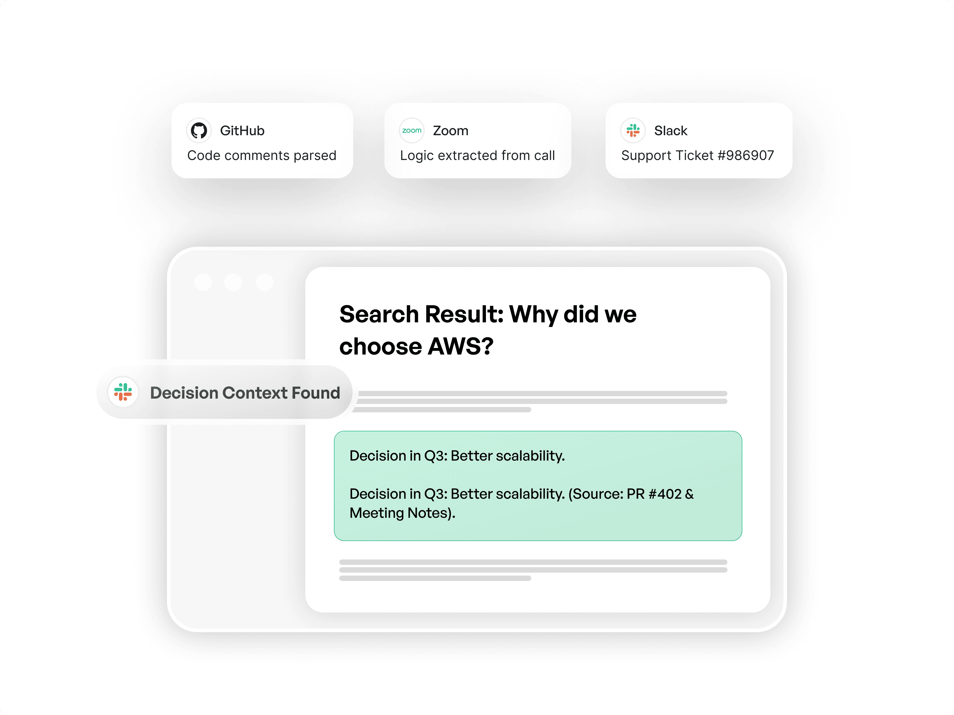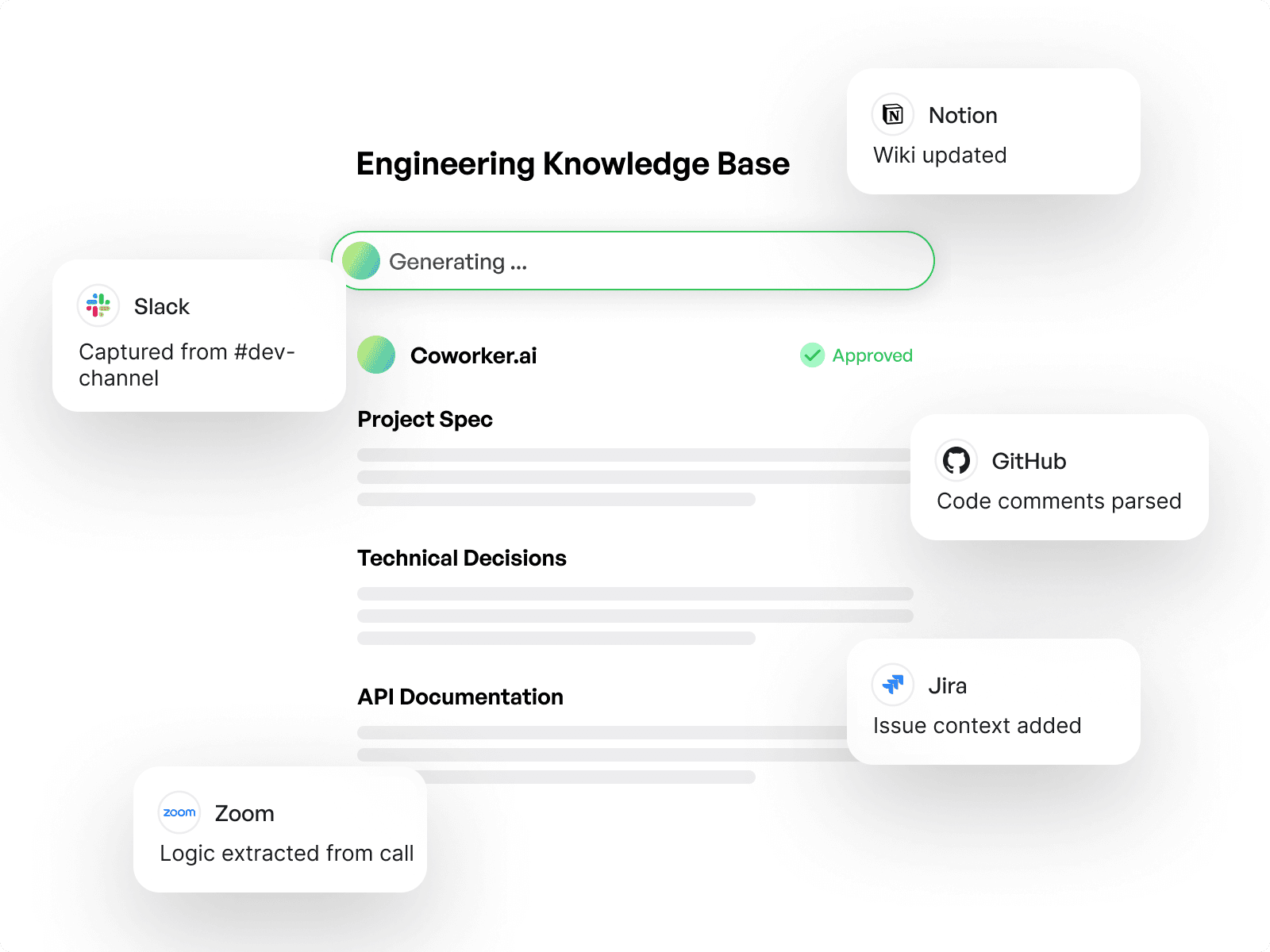 Formal documentation captures the outcome but rarely records why decisions were made. Coworker captures decision threads, meeting context and code review discussions so teams access both the what and the why in one search.