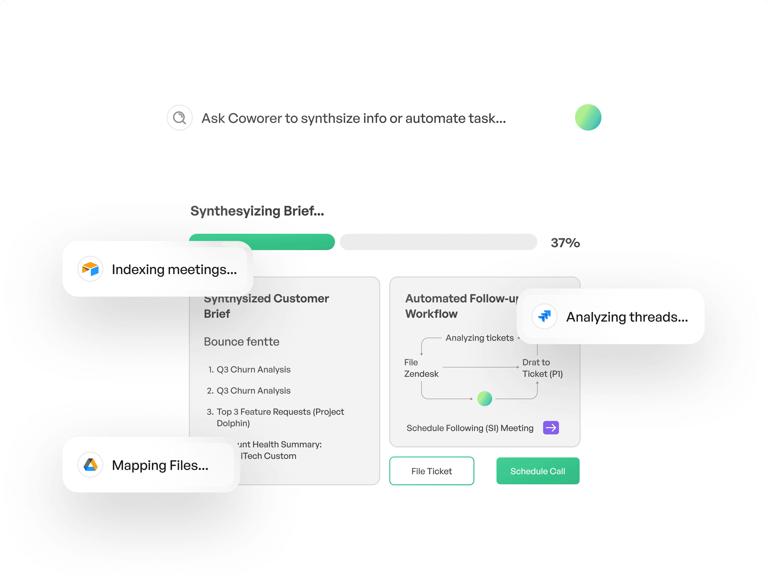 Beyond search, Coworker synthesizes multi-source briefs and can trigger workflows such as filing tickets or drafting updates. Teams get actionable outputs rather than just links to documents.