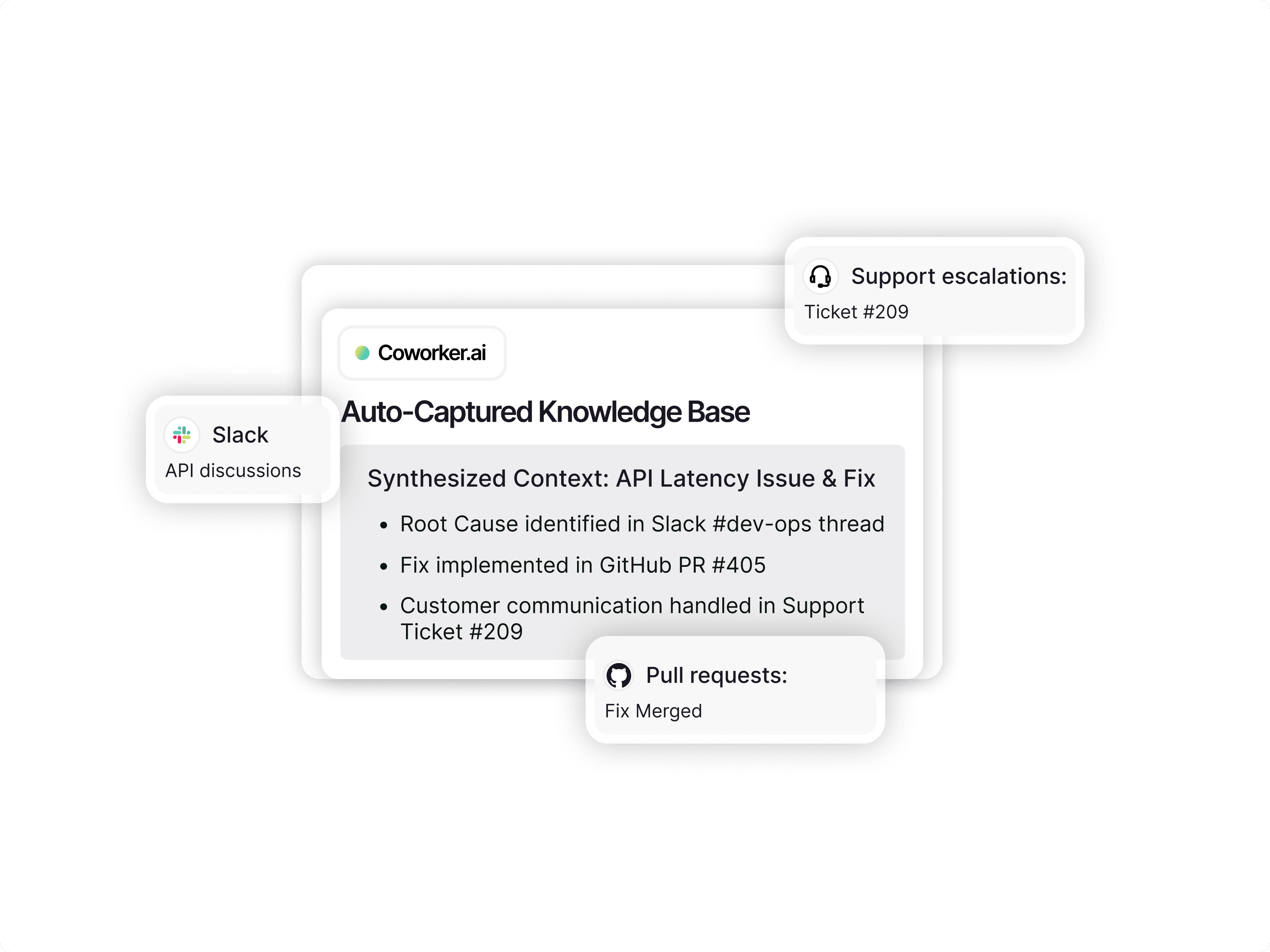 Important expertise often lives in Slack threads, pull requests and support escalations. Teams waste hours searching stale docs and then interrupt experts to fill gaps. Coworker captures that tacit knowledge automatically from existing workflows.