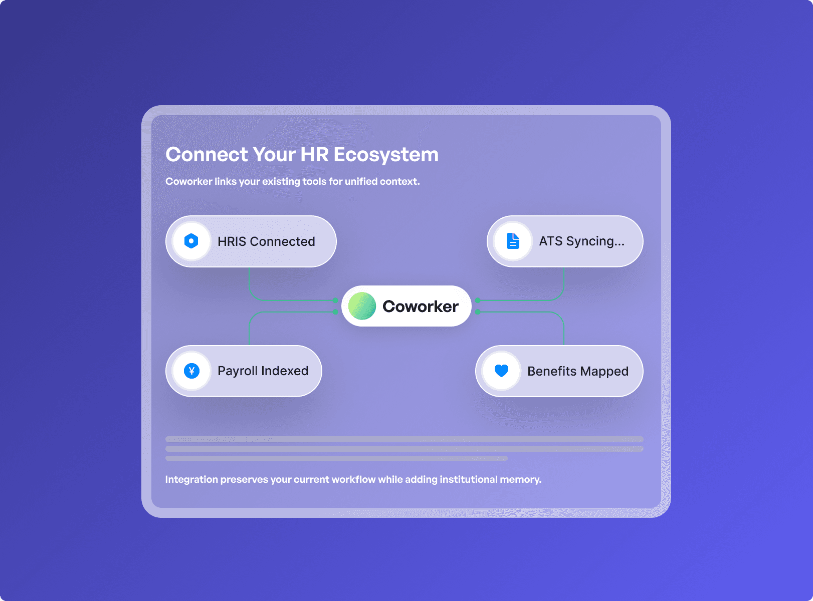 Coworker complements Ashby, Google Drive, and other HR tools instead of replacing them. Connect once and get a unified view across the systems you already rely on.