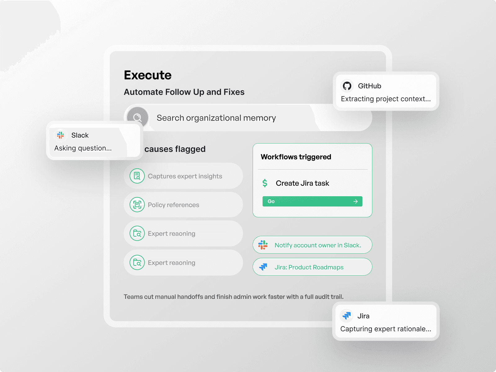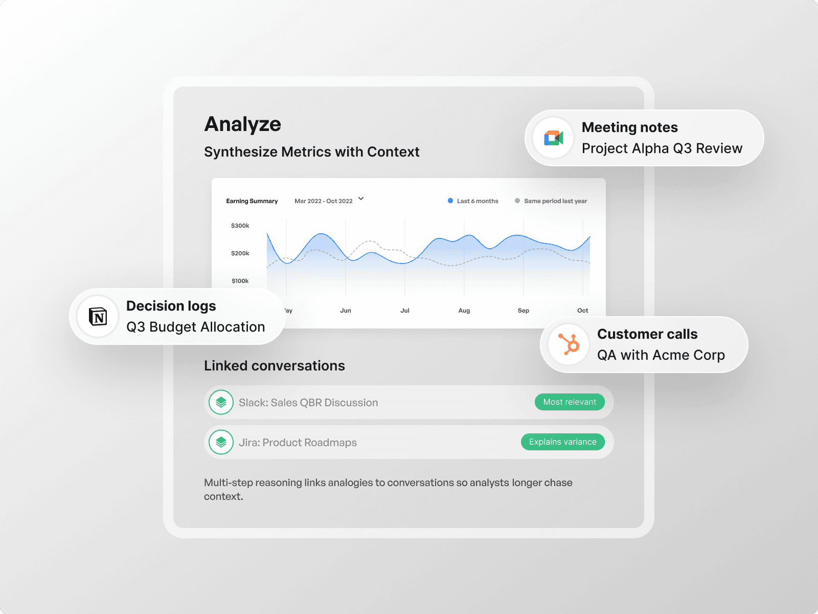Multi-step reasoning links dashboard anomalies to meeting notes, customer calls, and decision logs so analysts no longer chase context. The platform surfaces the most relevant conversations and decisions that explain changes in business metrics and reduces repeated follow-up work.