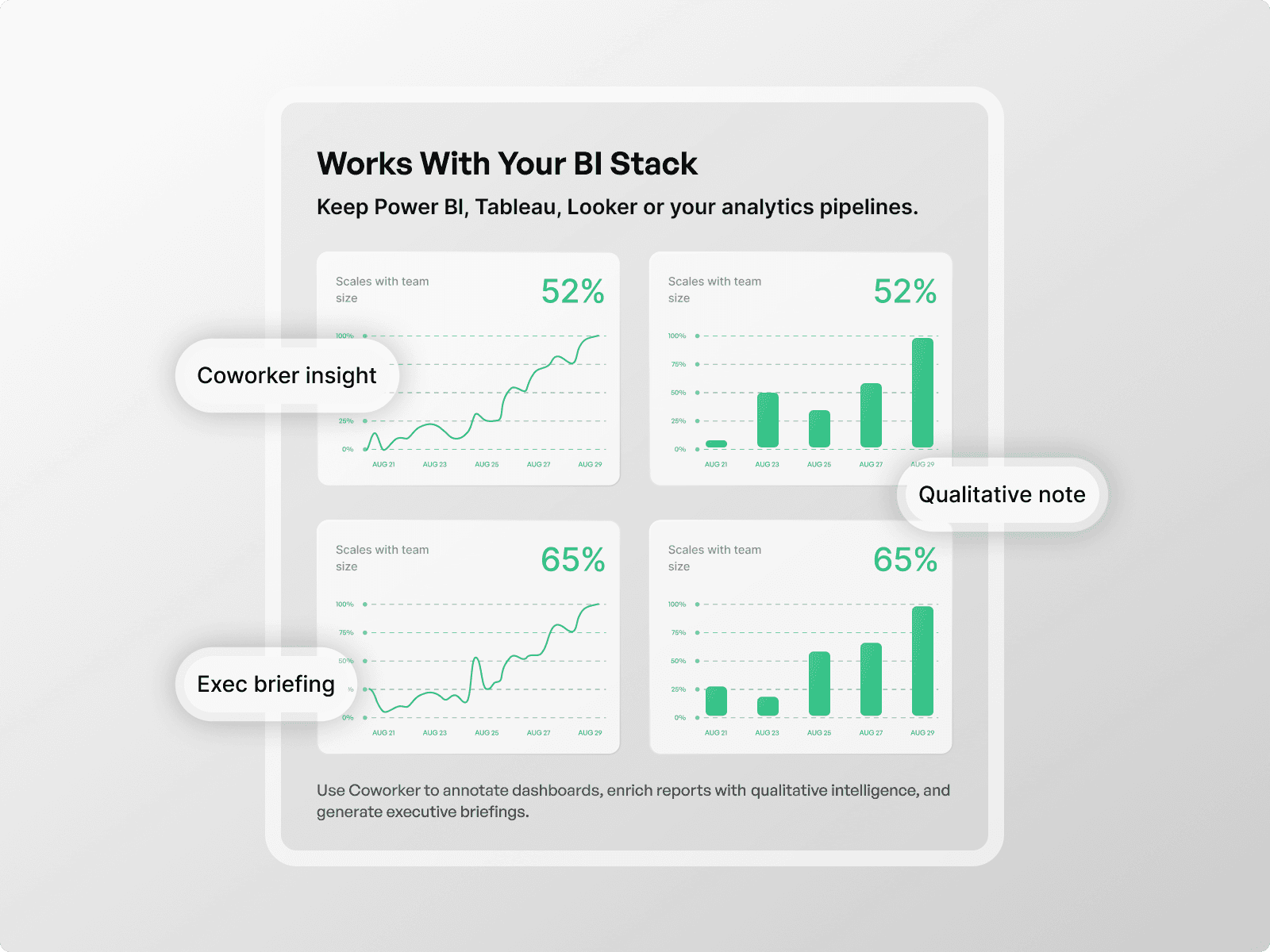 Keep Power BI, Tableau, Looker or your analytics pipelines. Use Coworker to annotate dashboards, enrich reports with qualitative intelligence, and generate executive briefings that combine numbers and organizational reality.