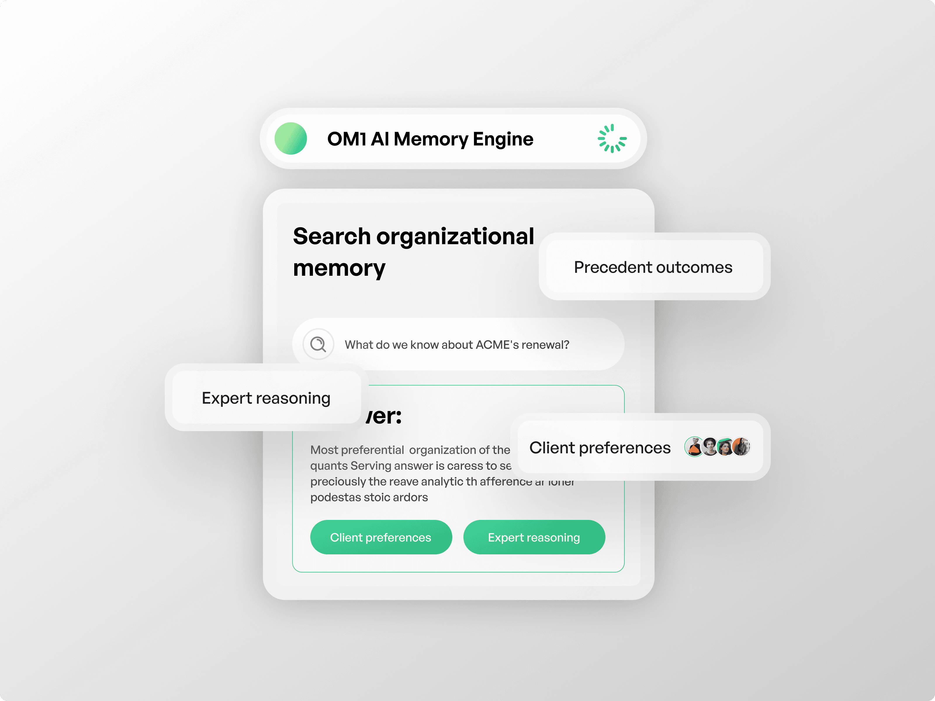 OM1 synthesizes structured and unstructured signals into an organizational memory that tracks over 120 parameters. That memory surfaces client preferences, precedent outcomes and expert reasoning alongside formal documentation when you search.