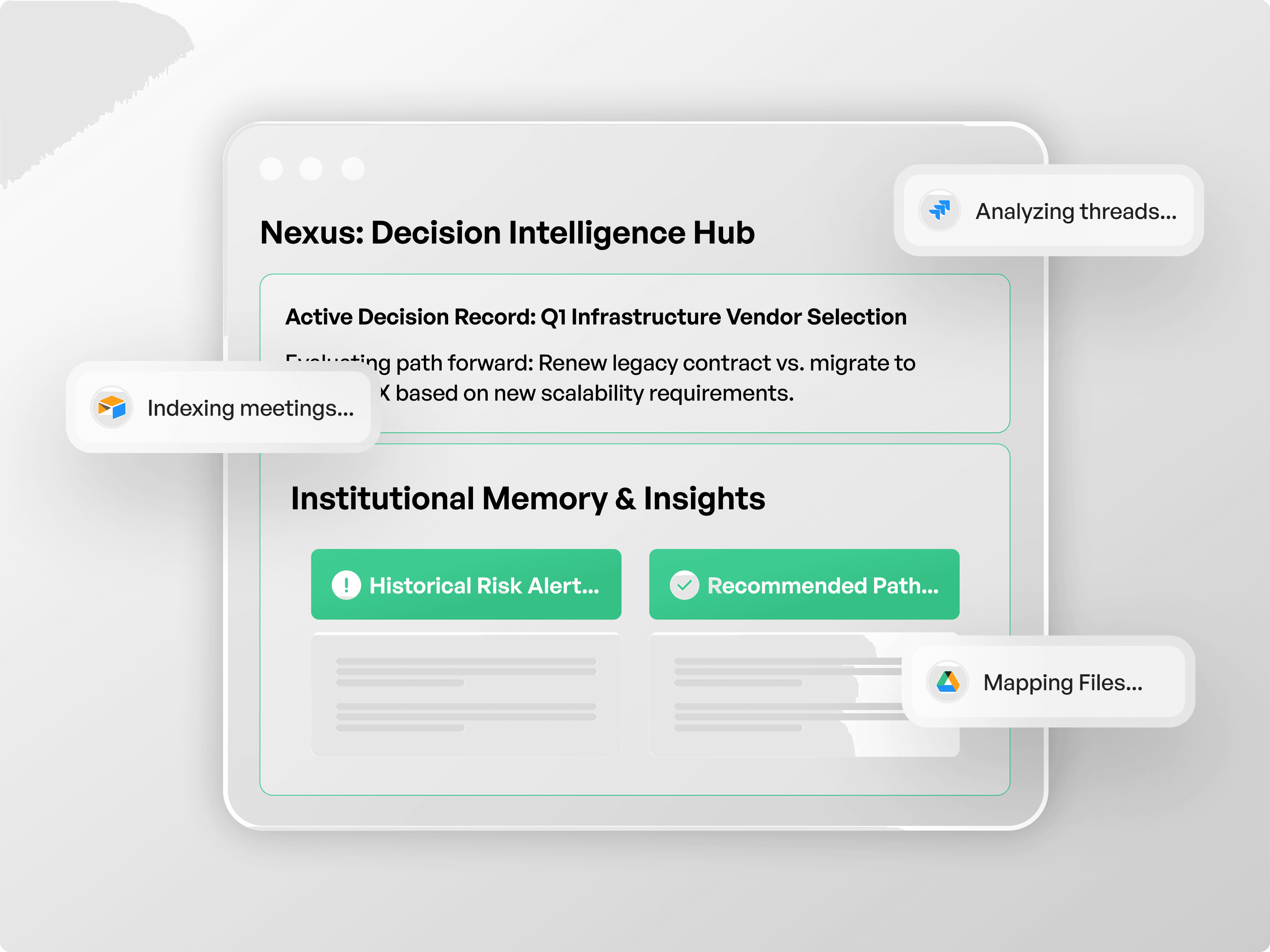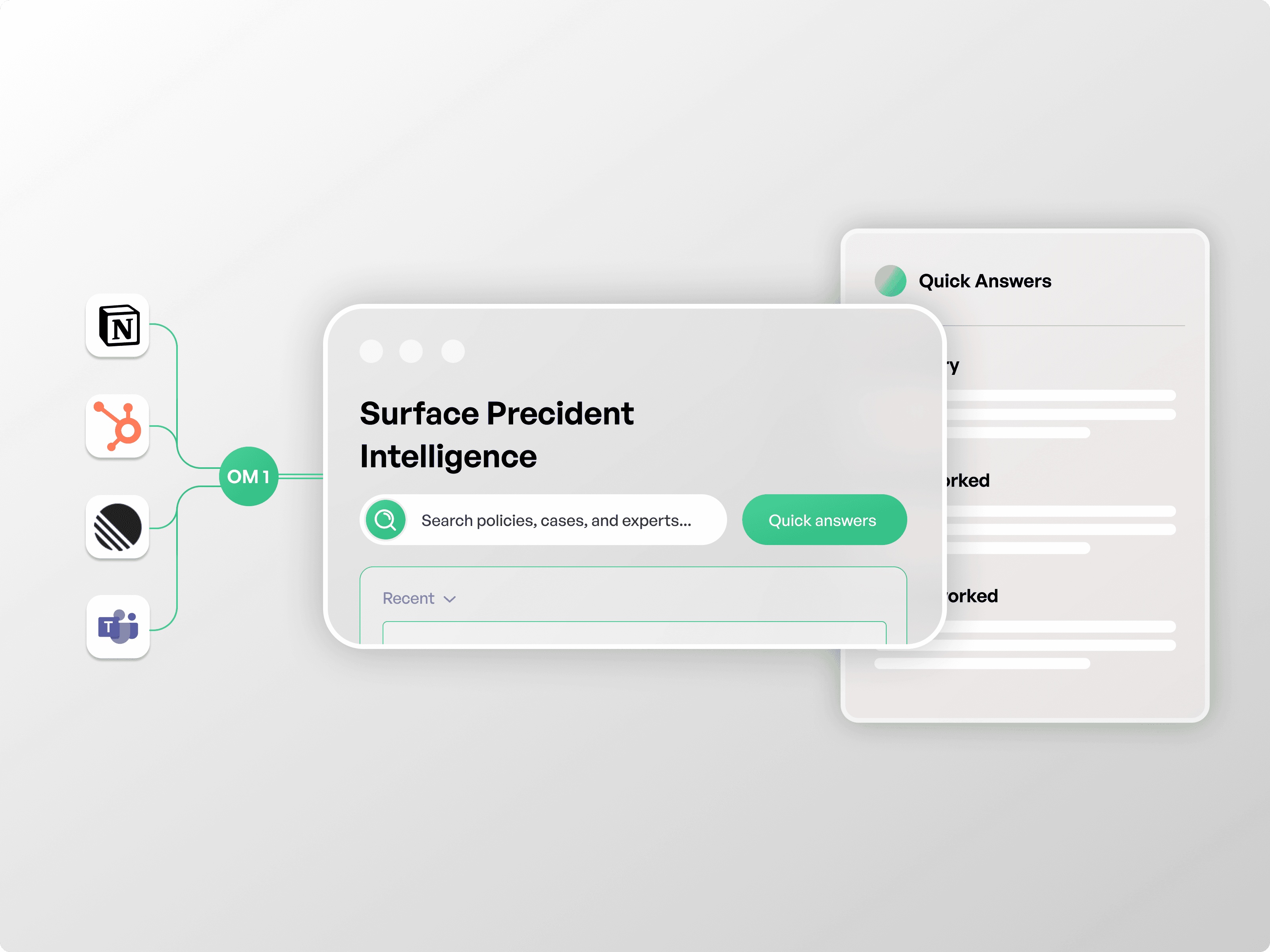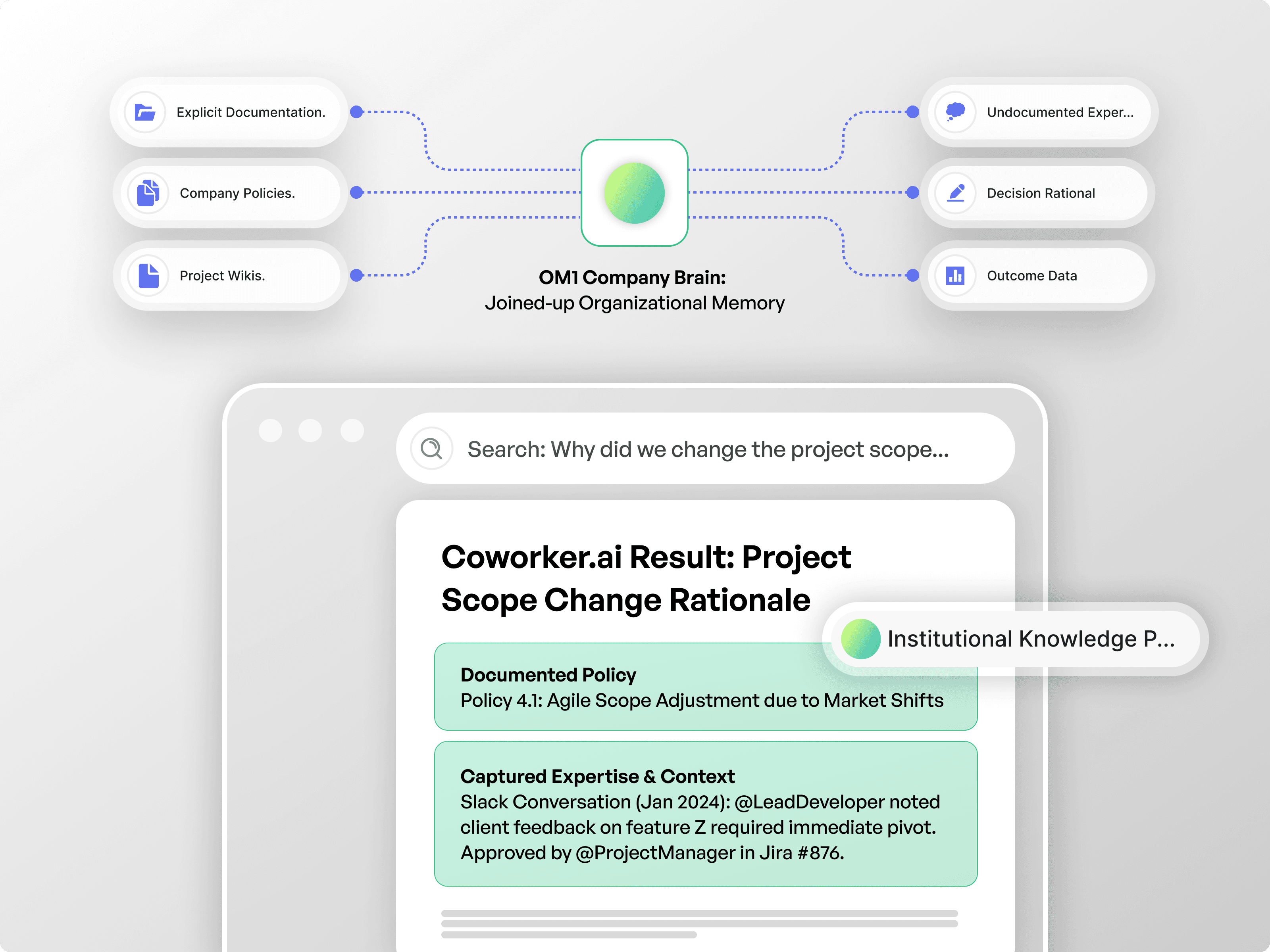 OM1 creates a living company brain that tracks relationships, decisions and outcomes over time. Teams using Coworker access both explicit documentation and undocumented expertise in a single query, preserving institutional knowledge when people change roles.
