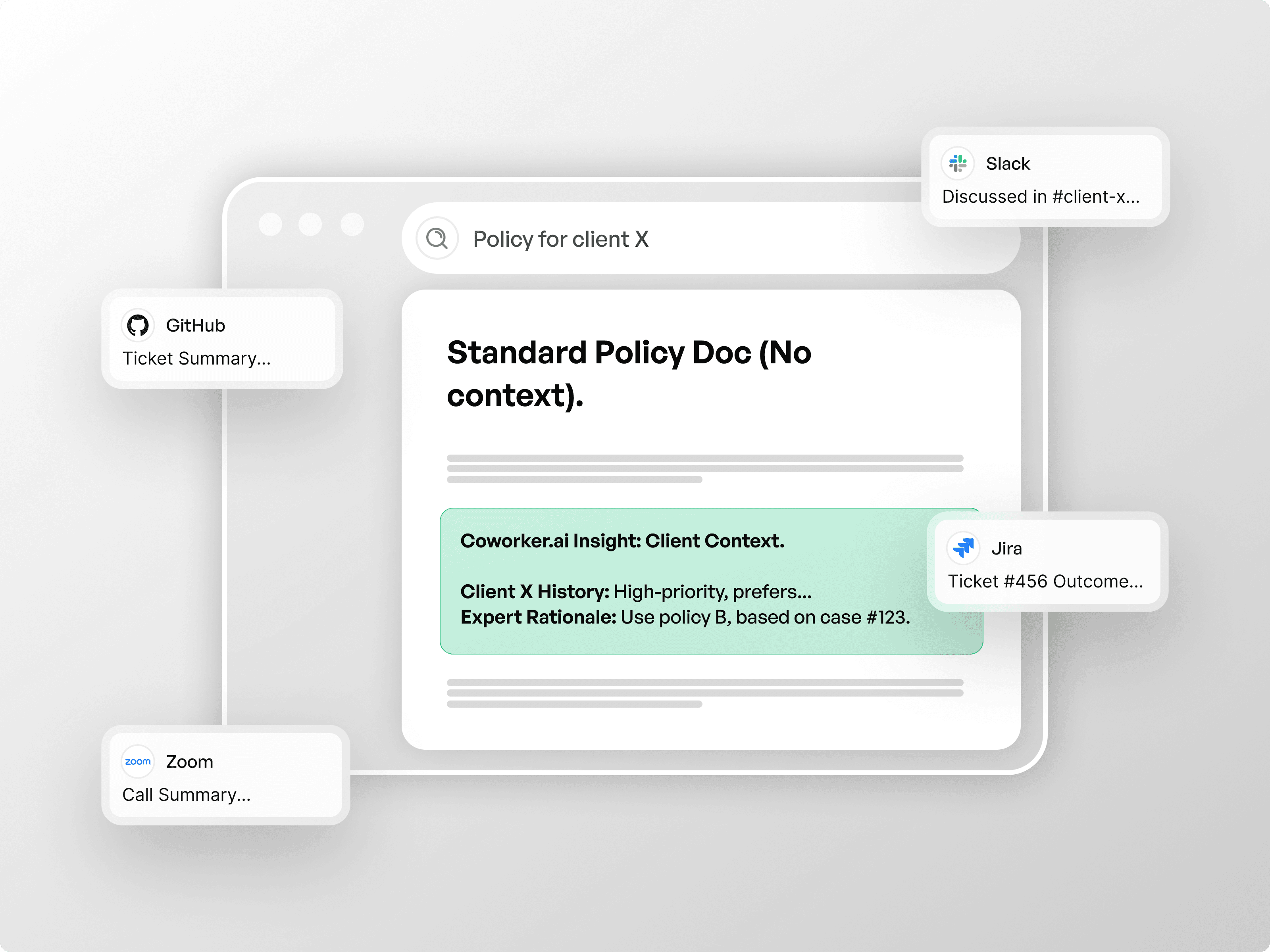 Most knowledge systems store policies and templates while the context that drives decisions lives elsewhere. Coworker pulls client history, case outcomes, and expert rationale into search results so teams apply the right precedent rather than guess from a generic procedure.